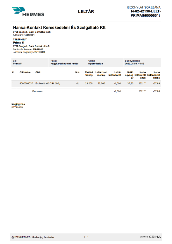 - Feldolgozás ideje: az az dátum és időpont amikor a leltár bizonylat kiállításra került